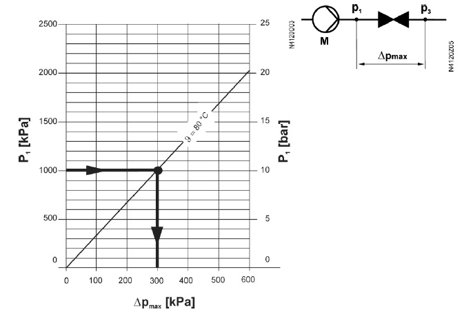 要避免冷凍水循環(huán)中的氣蝕現(xiàn)象,需要保證閥門出口有足夠的背壓,例如,在換熱器后加裝節(jié)流閥。按照下面的流量曲線圖中的 80 °C 曲線選擇閥門的最大壓降。